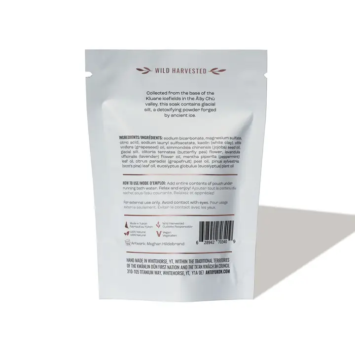 Transform your bath into a northern escape with this luxurious foaming soak made with hand-harvested glacial silt collected from the base of the Kluane icefields in the Ä’äy Chù valley. This mineral-rich powder detoxifies, mildly exfoliates, and softens the skin while Epsom salt relaxes tired muscles. Jojoba and grapeseed oils provide lightweight moisture, and butterfly pea flower adds antioxidants and a natural icy blue hue. Finished with an essential oil blend of lavender, peppermint, grapefruit, scot’s pine, and eucalyptus. Handmade in small batches in Yukon.