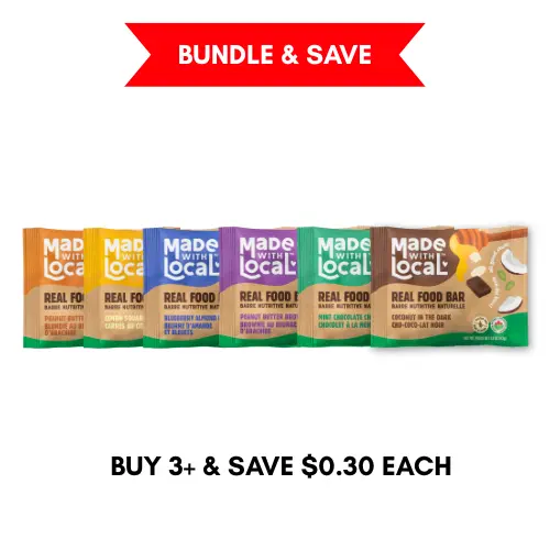 Snack smarter and save with Made with Local Real Food Bars! When you purchase 3 or more bars, you’ll enjoy $0.30 off each bar. Packed with wholesome, locally sourced ingredients, these bars are the perfect on-the-go snack—delicious, filling, and made in Canada. Choose from a variety of flavours to satisfy your cravings naturally.