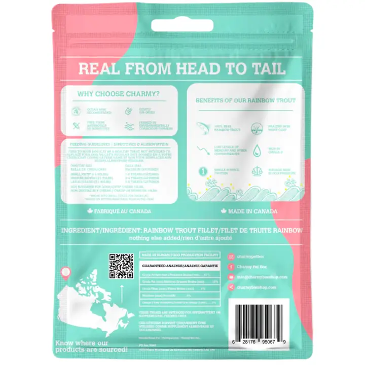 Give your dog a delicious boost of natural nutrition with Charmy Air-Dried Rainbow Trout Treats – crunchy, aromatic fish bites packed with protein and essential fatty acids. Made from 100% Canadian rainbow trout, these square-cut chunks are gently air-dried at low temperatures to preserve their rich flavour and nutrient density. Each bite supports cognitive health, joint mobility, and skin wellness, making these treats an excellent choice for dogs who need anti-inflammatory benefits or simply love a bold, fishy snack. Perfect as a daily reward, training treat, or nutritious topper, these single-ingredient trout bites contain no fillers, preservatives, or artificial ingredients—just pure, clean fish sourced responsibly in partnership with Ocean Wise.