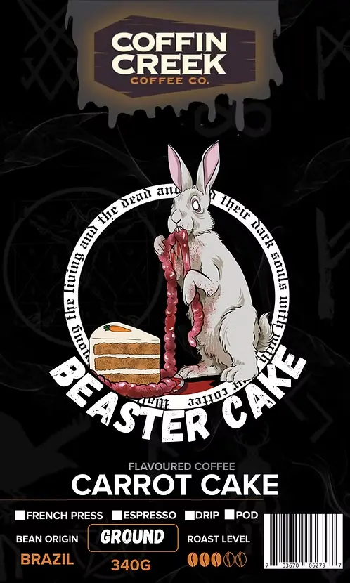 Sink your fangs into Beaster Cake, a carrot-cake-inspired brew that turns your coffee break into full-on dessert territory. Warm spice notes, sweet carrot cake vibes, and a creamy bakery finish swirl together for a cup that feels like it escaped the pastry case after dark. Smooth, indulgent, and dangerously sippable, Beaster Cake delivers that cozy cake-slice comfort… no fork required.
