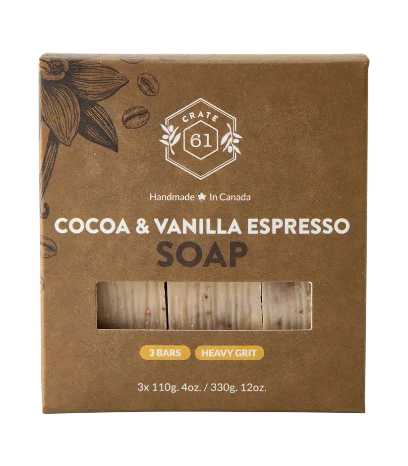 Indulge in the rich, comforting blend of creamy cocoa butter, smooth vanilla, and a hint of bold espresso with Crate 61’s Cocoa & Vanilla Espresso Bar Soap. Handcrafted in Canada using traditional cold-process methods, this 3-pack is made with 100% plant-based ingredients that create a creamy, bubbly lather while gently exfoliating the skin.