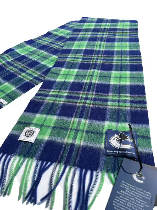 Show your team pride with the Vancouver Canucks Extra Long Lambswool Scarf by Patrick King Woollen Company. This original tartan design incorporates the date of the Canucks’ first NHL game, October 9, 1970, into the thread counts, creating a truly unique pattern. Crafted from premium lambswool—the softest, smoothest, and most resilient wool—this scarf provides superior warmth, breathability, and comfort. Hypoallergenic and luxuriously soft, it’s perfect for hockey fans and anyone who loves fine, wearable craftsmanship.