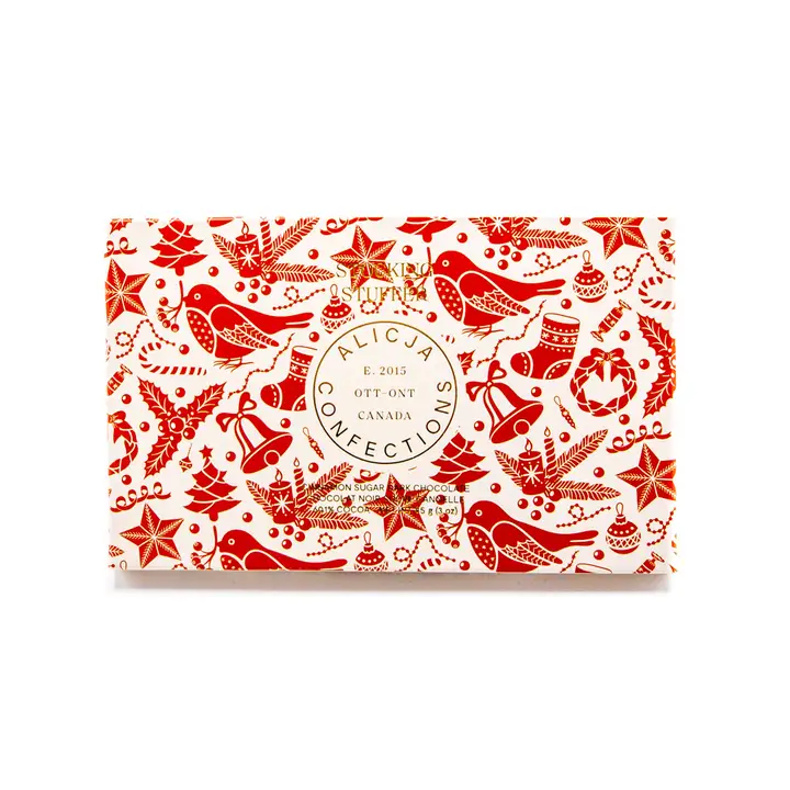 Make holiday gifting effortless with the Stocking Stuffer Vegan Dark Postcard Chocolate Bar. Crafted with rich, velvety 60.1% dark chocolate and topped with sparkling cinnamon sugar, this bar brings warm, festive flavour in every bite. Simple, elegant, and perfectly seasonal, it’s a delightful treat to slip into any stocking—or enjoy by the fire with a cozy drink.