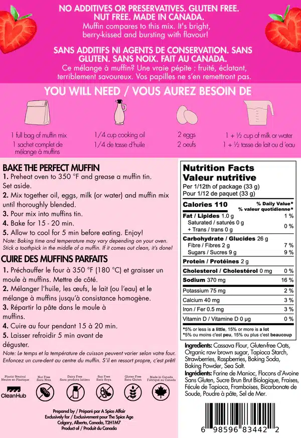 Muffin compares to this mix—truly. The Spice Age You Bake Me Blush Muffin Mix bakes up bright, berry-kissed, and bursting with flavour. With no additives, no preservatives, and absolutely gluten free and nut free, this mix delivers delicious, tender muffins that taste like they came straight from your favourite bakery.